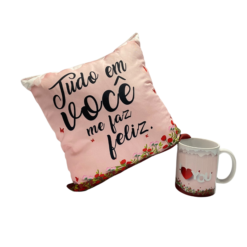 Conjunto Travesseiro Coração e Caneca Você me faz Feliz